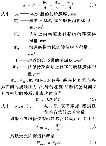 式中滑動速度V的計算可綜合考慮自旋滑動速度和差動滑動速度。固體潤滑軸承要獲得長壽命,在設計時應控制各滑動速度,減小接觸應力,在成膜時厚度應大一些。